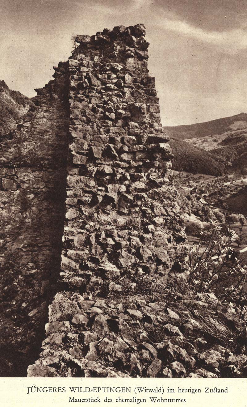 Der Ahnherr des Geschlechtes, der 1189 erwähnte Gottfried von Eptingen, mag seinen Sitz noch auf dem ältern Wild-Eptingen gehabt haben. Dieses wurde wohl schon vor dem Erdbeben von 1356 verlassen und an seiner Stelle das grösser angelegte jüngere Schloss Wild-Eptingen bezogen, später Witwald, etwa auch irrtümlich Witenheim genannt. Schon frühe verliessen aber die Eptinger ihre Stammsitze auf den Schroffen und Gräten des Juras oben im Diegter Tal, um sich neuen, ihnen besser zusagenden Wohnsitzen zuzuwenden. So treffen wir um 1300 Vertreter des Geschlechtes zu Blochmont in der Herrschaft Pfirt, zu Madeln oberhalb Pratteln, zu Bischofstein oberhalb Sissach, zu Wildenstein und zu Gutenfels oberhalb Bubendorf, sowie zu Ziefen. Die Stammburgen blieben gemeinsamer Besitz des Gesamthauses. Ebenso die Stammesherrschaft bestehend aus den Dörfern Eptingen und Ober-Diegten mit Zwing und Bann, hoher und niederer Gerichtsbarkeit und allen herrschaftlichen Gerechtsamen. Sie bildeten eptingisches Eigengut.
