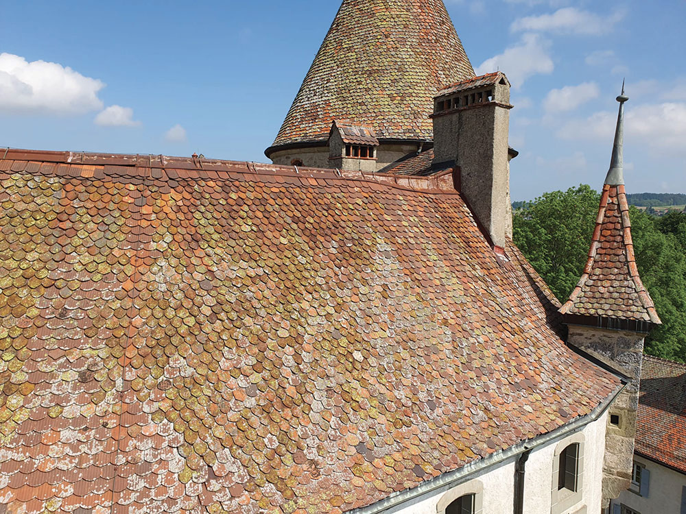 Plusieurs tuiles d'angle des deux tourelles avait été emportés lors des divers orages.L'accè à ces tourelles est très compliqué: soit des échafaudages, soit un camion nacelle.