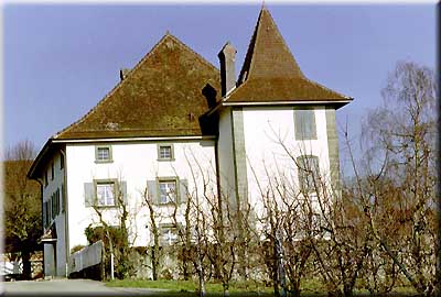 La silhouette très caractéristique de la maison de Grange - Verney, adossée à la colline, se détache sur l'écran verdoyant d'un bois de hêtres. Au premier plan, la terrasse, puis le jardin, vont, en gradins, rejoindre les vergers et les prés qui, par larges ondulations, descendent vers la Broye.
