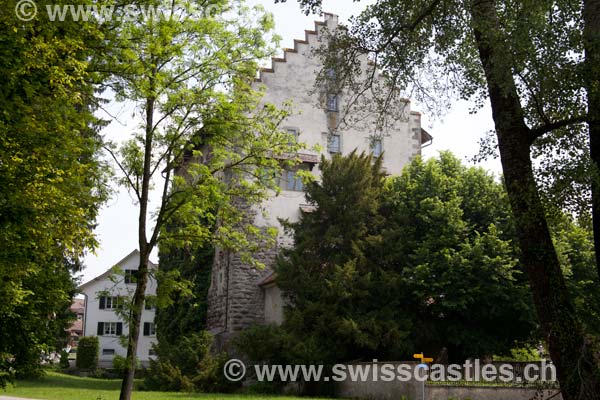 L'ancienne grange du château a été transformée en maison communale en 1971. L'assemblage angulaire fait de moellons en bossage, les deux fenêtres géminées romanes et la porte en plein cintre donnant, côté lac, accès à une galerie, portent à penser que ce bâtiment, la maison «Landenberg», date du XIIIe siècle. Le fait qu'il ait plus tard servi de grange n'est guère compatible avec l'élégance de sa construction. II a dû s'agir d'un corps de logis, ce qui est d'autant plus vraisemblable que le château lui-même, malgré ses importantes dimensions, n'offrait qu'une surface habitable restreinte en raison de l'épaisseur de ses murs (4,5 mètres). La maison communale actuelle forme l'angle ouest de la bourgade de plan triangulaire qui s'étendait devant le château. Les murs extérieurs des maisons servaient en même temps de remparts; ils étaient précédés d'un fossé artificiel d'environ six mètres de largeur et de trois de profondeur. Partant du lac et décrivant une large courbe, un second fossé ceignait la petite ville. Le plan de l'église est exceptionnel. La façade extérieure arrondie du sanctuaire forme l'extrémité est de la bourgade. Cette construction est due aux seigneurs de Landenberg-Greifensee, qui résidèrent au château au XIVe siècle.