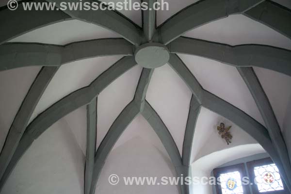 L'étage d'au-dessus, doté de simples piliers centraux et de fresques de plafond, paraît déjà plus confortable. On le couvrit d'une superstructure en pierre en 1707, après que celle en bois eut été détruite par un incendie. Au début, on ne pouvait accéder aux étages inférieurs que du niveau où se trouvait la porte surélevée. Les entrées directes furent pratiquées ultérieurement Le premier étage comprend une pièce gothique tardif datant de 1500 environ; après avoir été exposée un certain temps au musée de Stein am Rhein, elle a maintenant retrouvé sa place à Hegi. Le deuxième étage, affecté en salle d'armes, est orné des armoiries des baillis généraux de Zurich. Le château fit l'objet d'un important remaniement après que son propriétaire d'alors, Hugo de Hohenlandenberg, eut été élevé au rang d'évêque. Avec son frère Ulrich, le nouveau prélat fit entourer la tour de murs de trois côtés. Au nord, il fit ériger un spacieux édifice à colombage, la "maison des chevaliers". Trois angles du mur d'enceinte furent consolidés par des tourelles rondes; dans le coude nord-est, on édifia une tour polygonale et l'aménagea en chapelle.