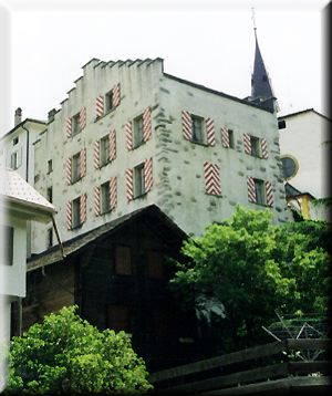 Das ca. 1519/1520 erbaute Wohnhaus des Humanisten und Landeshauptmanns Simon In-Albon (1492-1540) ist nicht ein Schloss. Ich glaube, dass das Haus in früheren Publikationen mit dem sogenannten "Blandrate-Schloss", welches sich wirklich auf dem alten Burghügel Gräfin-Biel befand, verwechselt wurde. Das "Blandrate-Schloss", oder was davon übrig ist, erhebt sich östlich des Hauses von Simon In-Albon und ist mit diesem durch eine "Wohnbrücke verbunden. Nach dem grossen Erdbeben 1855 wurde mit Einbezug der Ruinen das mit einem Walmdach versehene Gebäude erbaut, welches heute noch zu sehen ist. Die bis zum ersten Stockwerk reichenden Mauern verraten jedoch noch heute das hohe Alter (Ähnlichkeiten im Mauerwerk mit dem sogenannten LOCHMATTER-TURM) Doch zurück zum Haus des Simon In -Albon: